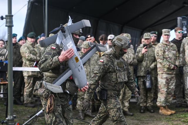 当地时间2025年11月18日,波兰新德巴,北约反无人机系统实弹演习期间,一名波兰士兵携带Merops无人机。此次演习由波兰国防部主办,波兰士兵与罗马尼亚和美国军队完成了在乌克兰成功使用的反无人机系统训练。北约成员国波兰和罗马尼亚部署了这些系统,作为“东方哨兵行动”的一部分,这是北约对俄罗斯无人机近期侵入欧洲领空的回应。视觉中国 图