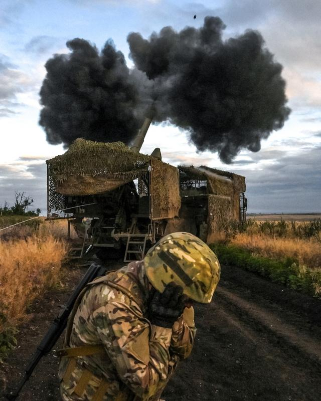 当地时间2025年7月2日,顿涅茨克地区,俄军“中央”集群的士兵在前线操作2S44“风信子-K”自行榴弹炮向乌克兰阵地开火。视觉中国 图