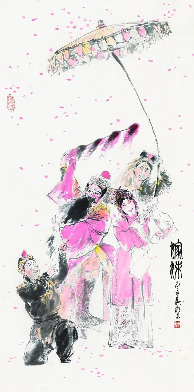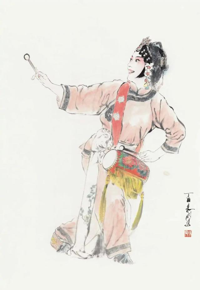 “我画的是舞台上的演员,更是我心中理解的人物。”朱刚这样阐述他的创作理念。他笔下的人物形象,既源于对戏曲程式、演员神态的长期观察与熟稔,又绝非简单摹写。例如在描绘杨贵妃时,他在严谨遵循舞台服饰程式的基础上,于画面中添加了纷落的花瓣,以此象征人物陨落的悲剧命运。他将戏曲视为对生活的“二度创作”,而自己的画作则是对舞台艺术的“三度创作”,在传递程式之美的同时,注入个人对角色的理解与诗化想象。