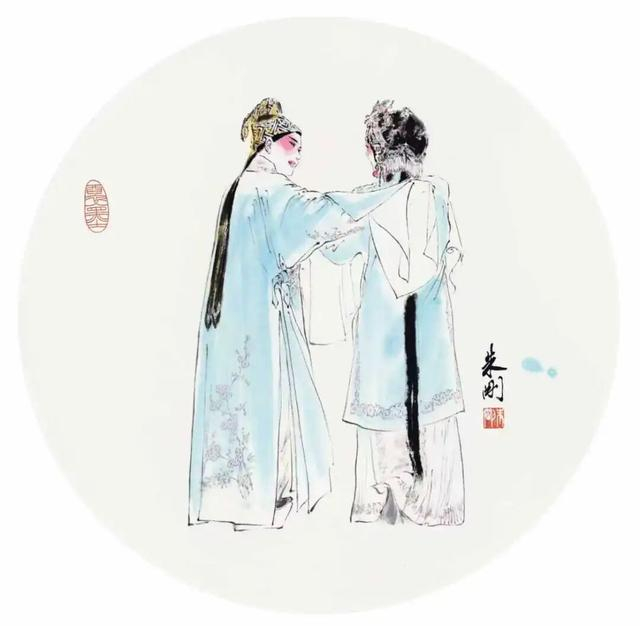 朱刚的戏曲人物画创作始于上世纪80年代的一次“无心插柳”。当时在出版社担任美术编辑的他,为打破音像制品封面多为港台歌星大头照的单调格局,尝试为越剧《红楼梦》磁带绘制了水墨风格的贾宝玉与林黛玉画像。这幅作品不仅获得了同事的认可,更打动了徐玉兰、王文娟等表演艺术家,这份来自戏曲界的首肯,为他埋下了创作的种子。