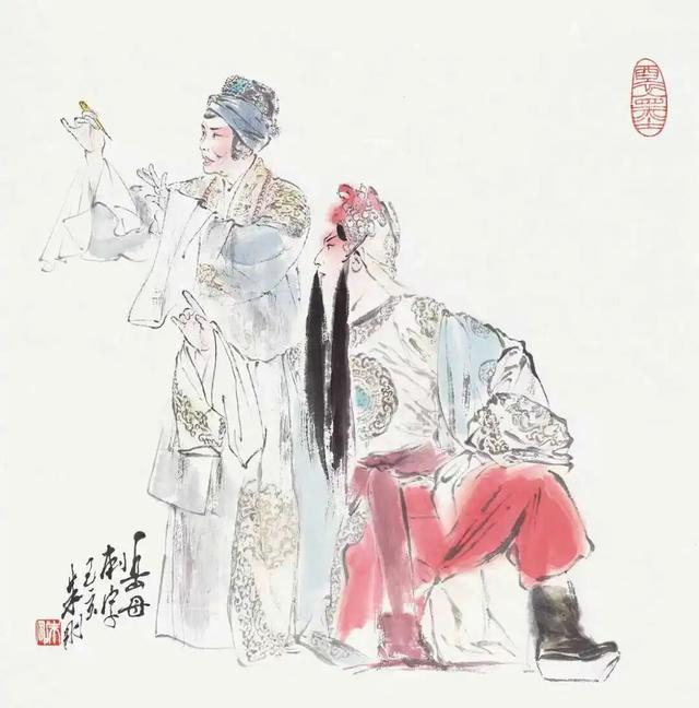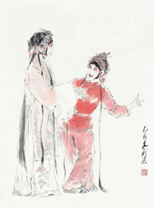 朱刚的戏曲人物作品聚焦于人物神态,尤其精于眼神刻画,面部描绘细腻传神,服饰则在保持程式准确的前提下适度概括。这种“突出重点”的手法,结合对舞台构图的主观提炼,使其作品超越了单纯的叙事,更具情感张力。