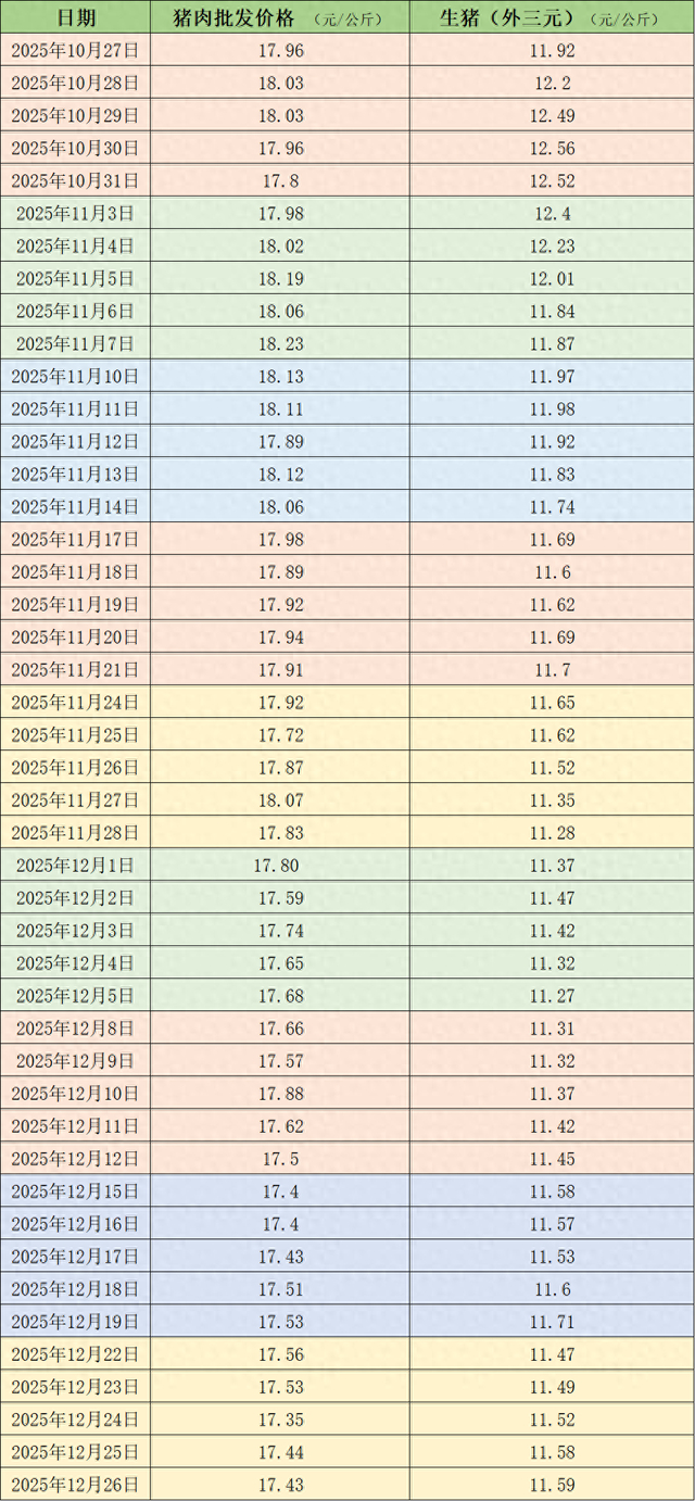 据农业农村部监测,12月26日,全国农产品批发市场猪肉平均价格为17.43元/公斤,与上周五(12月19日)的17.53元/公斤相比,下降0.6%。本周的平均价格为17.46元/公斤,与上周17.45元/公斤的均价相比,基本持平。
