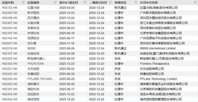 其中,广州新济医药股份有限公司、深圳四方精创资讯股份有限公司、浙江米奥兰特商务会展股份有限公司、Frontera Therapeutics、龙迅半导体(合肥)股份有限公司、瑞派宠物医院管理股份有限公司等6家公司为首次递交。