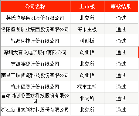 同时,拟在北交所IPO的英氏控股集团股份有限公司(下称“英氏控股”)、宁波隆源股份有限公司(下称“隆源股份”)、普昂(杭州)医疗科技股份有限公司(下称“普昂医疗”)、浙江新恒泰新材料股份有限公司(下称“新恒泰”)等也成功过会。