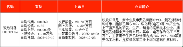 从时间表看,誉帆科技(001396)、强一股份(688809)、双欣环保(001369)等均将在本周二(12月30日)上市;蘅东光(920045)将在本周三(12月31日)上市。