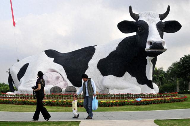 2010年2月27日,深圳光明农科大观园,晨光奶牛示范场的奶牛雕塑。视觉中国 图二战后美国等发达国家以粮食援助的形式向亚洲和许多第三世界国家提供粮食出口补贴,改变了这些国家人民的饮食方式,创造了新的饮食文化,日本的“拉面”就是一个典型的例子,来自美国援助的大量廉价小麦面粉。麦秀华认为,20世纪80年代欧洲通过粮食援助计划向中国出口牛奶,为后来的“牛奶变革”埋下伏笔;而雀巢等跨国乳品公司通过在中国建立生产工厂、积极开展营销活动,进一步推动了牛奶及奶制品在东亚地区大肆扩张,深入人心。