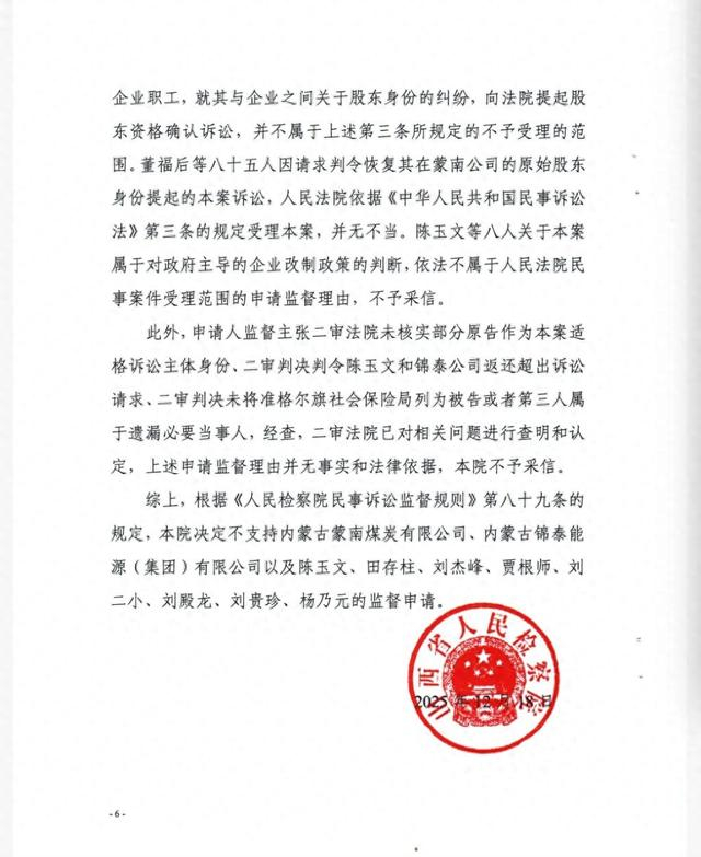 12月28日,内蒙古蒙南煤炭有限公司(以下简称“蒙南公司”)退休矿工代表收到山西省检察院寄来的不支持监督申请决定书。决定书称,蒙南公司一方不服董福后等85人股东资格确认纠纷一案的二审判决,申请监督,该院认为该案不符合监督条件。