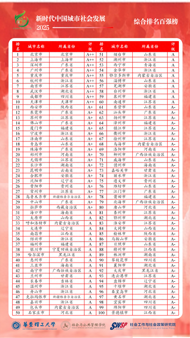 2025年12月29日上午,“中国城市社会发展指数研究”课题组在上海线上发布“新时代中国城市社会发展指数暨百强榜(2025)”,这是由上海高校智库“华东理工大学社会工作与社会政策研究院”何雪松教授和吴开泽研究员领衔的智库重点研究项目。