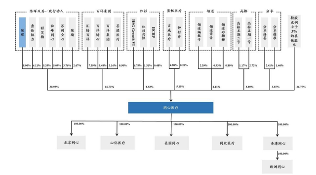 同心医疗股权结构 来源:招股书股东方面,截至招股说明书签署日,同心医疗的控股股东、实际控制人是创始人陈琛,其直接持有3537.2162万股股份,占7.9951%,系第一大股东,合计可以控制发行人30.9508%股份的表决权。在经营层面,陈琛还担任董事长和首席技术官。