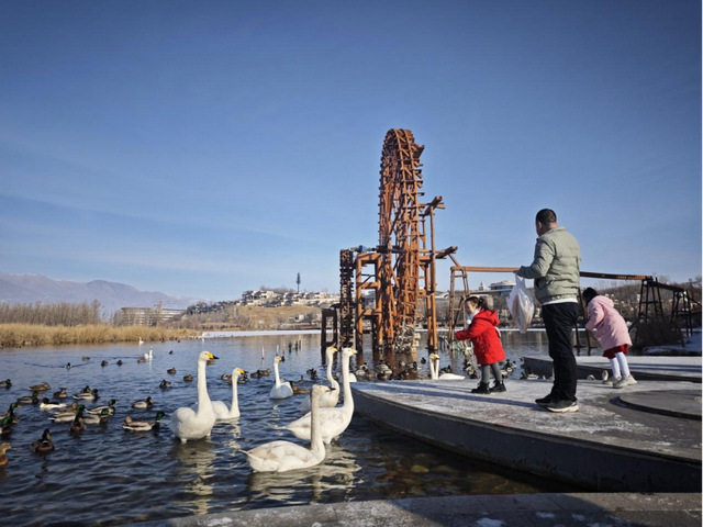 12月下旬的一个周末,午后天气放晴,父亲带着孩子在温泉县湿地公园里喂天鹅。