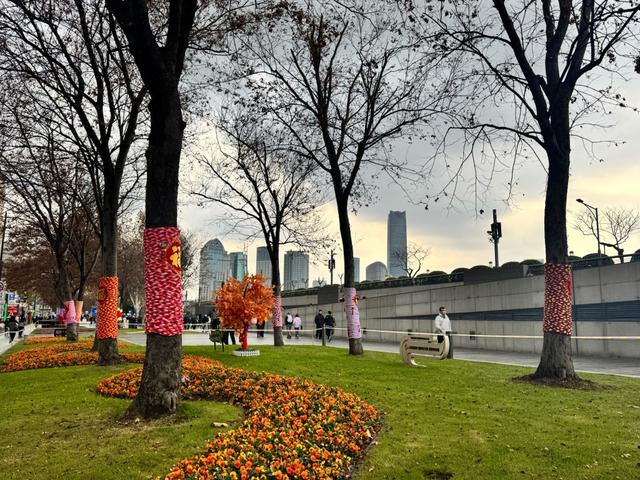 12月31日下午2时许,澎湃新闻(www.thepaper.cn)记者在现场看到,在中山东一路沿线,部分行道树及景观树已穿上毛织艺术装饰,核心装饰元素包括中国结、鞭炮串、福字等。五颜六色的“毛衣”搭配鲜花盛放的绿化带,为冬日的外滩景区增添了融融暖意。