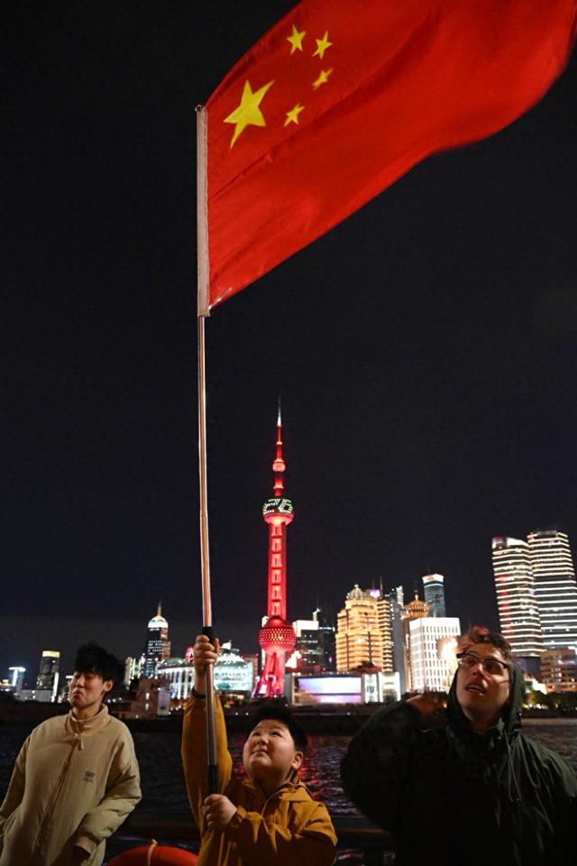 0点钟声敲响,孩子在外滩亲水平台上挥舞国旗迎接新年的到来。澎湃新闻记者 吴栋 图徐汇滨江:解锁 “新年第一游”新玩法