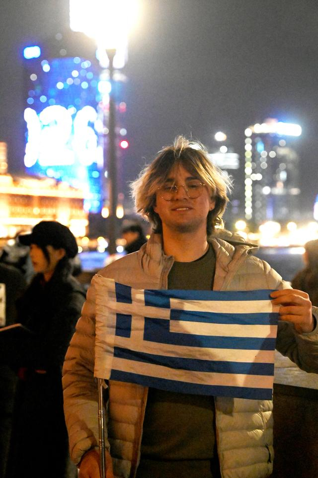 希腊游客Hercule与家人一同在上海迎新,特意带了一面希腊国旗。澎湃新闻记者 吴栋 图南京路:30余家商户“跨年不打烊”