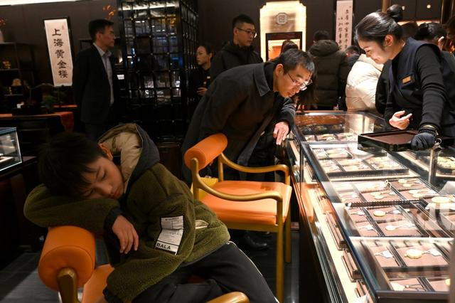12月31日,南京路上的一家金店的顾客络绎不绝,一个孩子在等父母购物时睡着了。当日,这家金店将营业至凌晨两点。澎湃新闻记者 吴栋 图