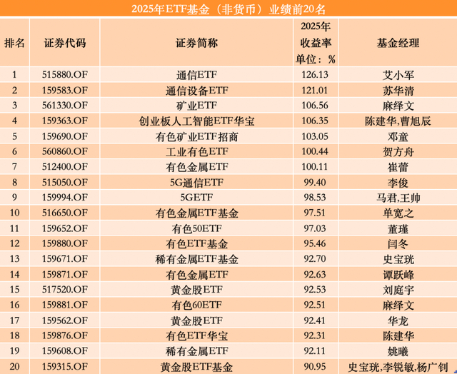 其中,国泰通信ETF以125.81%的年度涨幅拿下ETF基金冠军,富国通信设备ETF以121.37%的收益率获得亚军,国泰矿业ETF涨幅106.11%,位于第三名。此外,华宝创业板人工智能ETF、招商有色矿业ETF、万家工业有色ETF与南方有色金属ETF全年收益率也均超过100%。