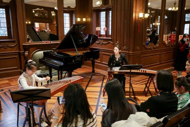 在城市音乐会客厅镜厅内,6名来自钢琴系、民乐系、音乐教育系的学生志愿者,先后指导12名中小学生演奏基本曲目。这场“大手牵小手”的开放式音乐课堂,全程向市民开放,吸引不少家长和市民驻足。