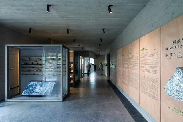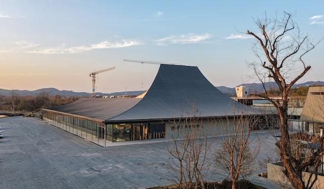 该博物馆由知名建筑师柳亦春设计,以“传统文化底蕴的当代建筑”为设计目标,取汉字“舍”笔画组成的三部分:亼、屮、口,对应表达了传统建筑中基座、支撑、屋顶的三个基本要素为设计概念。建筑被分解为两个部分,一部分沿水长向展开,创造一个独特的建筑形象,另一部分采用了地景建筑的策略,利用场地坡度高差,将建筑半嵌入地形之中。主体场馆的曲面屋顶,既是传统形式的观照,实际也是地景的延伸。而局部的庭院则提供了采光通风和氛围营造。
