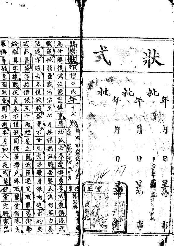 不过在地方司法实践中,妇女需要抱告是毫无疑问的,证据是档案中的《状式条例》。清代的状子需要写在一种特定格式的纸上,其最后往往附有一系列关于谁在何种情况不准告状的诉讼规则,这就是《状式条例》。目前保留下来的几乎所有《状式条例》中都会有类似“有职人员及监贡生员、妇女,无抱告者,不准”的规定,甚至对妇女告状做出了更加严格的限制,比如“细事牵连妇女,及夫男现在,支妇女出头者,不准”。现存以女性为原告的清代诉状中,绝大部分都有抱告,如前文杨颜氏的抱告是其小儿子杨洪兴,在笔者所检视的所有312份女性呈交的状子里,只有15份没有抱告,而杨长姑就是其中之一。