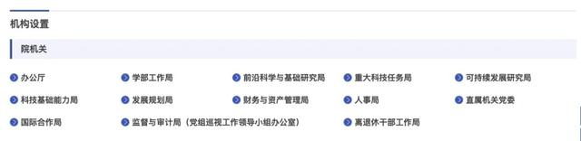官网显示,目前,中科院院机关包括:办公厅、科技创新发展局、基础科学研究局、战略高技术研究局、重大专项研究局、可持续发展科技研究局、科技基础能力局,学部工作局、人才与人事局、国际合作局、财务与资产管理局、审计与监督局(党组巡视工作领导小组办公室),机关党委、老专家老干部服务局。