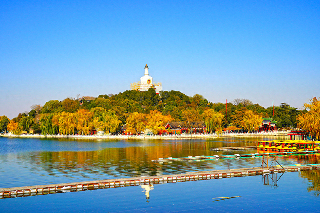 2025年11月22日,北京,在蓝天映衬下,北海公园被冬日的暖阳照耀着,美景如画。视觉中国 资料图