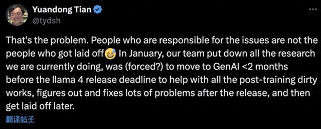 田渊栋说,在2025年1月底被要求加入Llama4救火时,就曾想过未来的四种可能性,如果最后项目没有成功,也至少尽力而为,但遗憾的是,最后发生的是没在计算之内的第五种可能,被裁员。