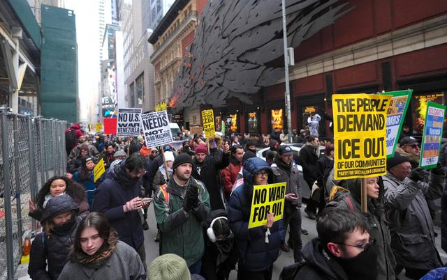 1月3日,美国纽约,民众在曼哈顿街头举行示威游行,抗议美军对委内瑞拉发起的军事打击行动。视觉中国 图据总台环球资讯报道,1月3日,《今日美国报》网站发布的评论文章说,特朗普政府对委内瑞拉采取军事行动,既没有征得国会的同意,更没有征得美国民众的同意。
