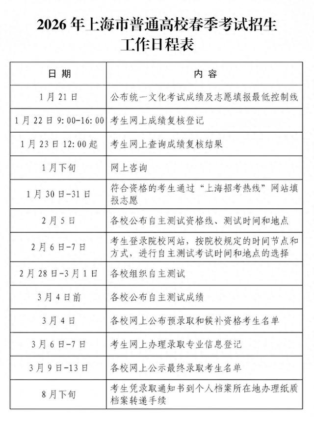 上海2026年春考招生日程表。上海市教育考试院图根据日程安排,2026年春考统一文化考试成绩总分达到志愿填报最低控制线的考生,可于1月30日9:00-22:00、1月31日9:00-16:00期间,登录“上海招考热线”网站(www.shmeea.edu.cn)填报志愿。