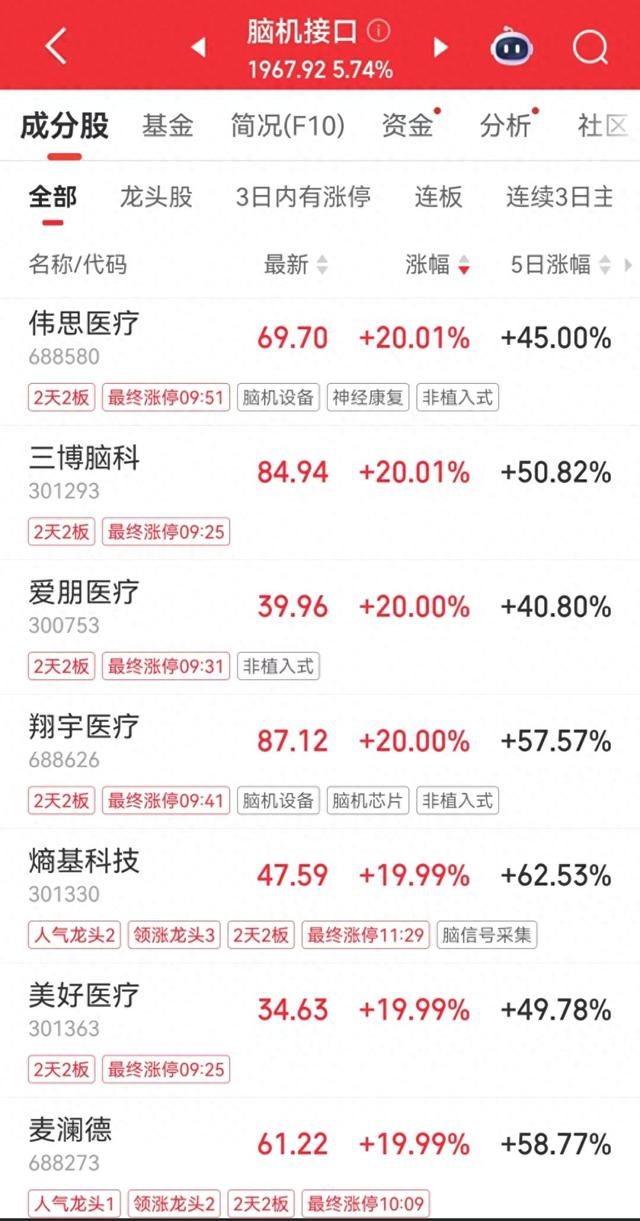 二连板航天长峰也发布了股票交易异常波动公告,称公司主营业务分为军工电子、公共安全和高端医疗装备三大板块,目前公司未实际开展脑机接口等相关业务、不从事商业航天相关业务。公司未实际开展脑机接口等相关业务、不从事商业航天相关业务。