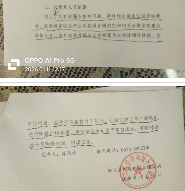 据袁女士提供的信访资料显示,2025年12月31日,安吉县住房和城乡建设局出具信访处理意见书称,袁女士居住房屋的地下室内未发现明显渗漏点,表明地下室防水符合要求,但室外检测开挖点长期裸露后会加速螺杆锈蚀,易发生次生安全隐患,应及时回填。对于前述处理情况。袁女士说,针对锈蚀螺杆氧化问题、地下室内渗水、地下室剪力墙外侧高位积水等问题始终未能得到解决。