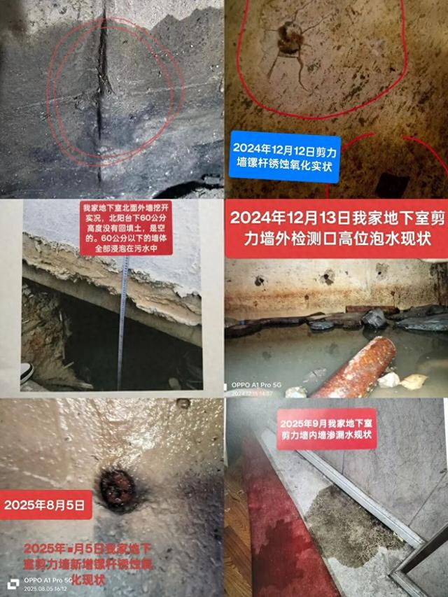 图为袁女士提供的地下室高位泡水、剪力墙开裂及螺杆锈蚀情况。