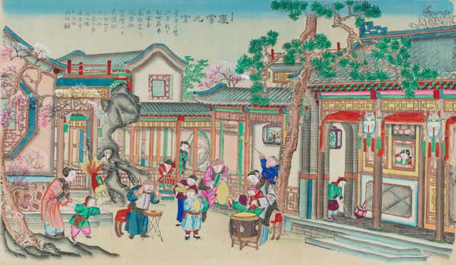 天津杨柳青版画《庆赏元宵》图绘元宵佳节场景,后庭小院内,妇女和儿童击锣打鼓,敲钹吹号,或手举花灯,游戏其间。图左,一妇人牵着戴红风帽、穿绿衣粉裤的女孩,女孩手中举红色金鱼花灯出门游玩。画廊之下,穿绿马褂、戴红暖帽的儿童双手推着“捻捻转”小花灯,独自前来嬉戏。雕梁悬挂明角宫灯,红绸结彩,壁灯彩画芝兰,照亮走廊。上元灯景的节日气氛,更显欢乐喜庆。图上题诗一首:“金吾不禁逐年新,鼓吹升平共闹春。最好家家饶乐趣,买灯三日更欢欣。”后署题记有“癸卯”及“高荫章桐轩氏”字样,可知此图为晚清名画家高桐轩作,绘刻年代为1903年。r