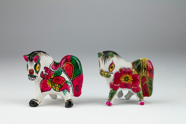 《百马贺年》剪纸 汉声供图来自陕西凤翔的马泥塑憨态可掬。陕西凤翔泥塑造型多样,其中动物造型的泥玩具多以十二生肖为原型,如坐虎、马、猪、兔等。其风格古朴可爱,造型饱满,轮廓流畅,整体简练概括又鲜活生动。艺人们以现实生活为蓝本,融入想象与创造,塑造时多突出动物正面形象,更重神韵而非形似。这些泥塑既供孩子玩耍,又具辟邪纳福的功用,如当地孩子满月时,长辈会送坐虎,祝福健康富贵。装饰分彩绘与素绘两类:彩绘色彩鲜艳明快、对比强烈,视觉冲击力强;素绘则以墨线勾勒,简洁优雅。所绘纹样均具吉祥寓意,寄托着人们对美好生活的向往。