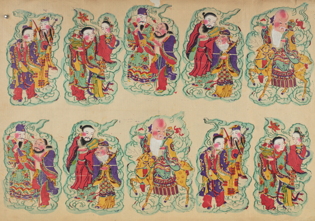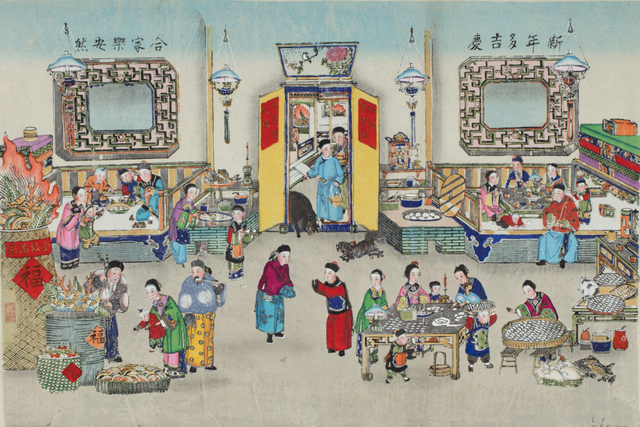 一件天津杨柳青版画名为《新年多吉庆 合家乐安然》。这幅杨柳青年画将清末北方除夕合家欢乐、团年守岁的场景一一呈现。屋内灯火通明,新换门联喜庆吉祥,肥猪拱门寓意富足。吃过年夜饭,妇女们正围桌包“更岁饺子”。两位青年互相作揖道喜,一人特意露出腰间新佩怀表,惹人注目。炕上,一老年妇人与儿孙晚辈绕桌围坐,边聊天边饮酒守岁。桌上未吃完的年夜饭之鱼,取意年年有余。另一侧,几个儿童正掷骰博戏,旁边放着几串新收的压岁钱。灶火通红,蒸笼里大馒头热气腾腾,锅内水饺不停翻滚。神龛上新接灶神,香烛五供俱全。院内屋内皆是财宝满囤,聚宝盆宝光熠熠生辉。门两侧的花窗上书“新年多吉庆,合家乐安然”点明主题。