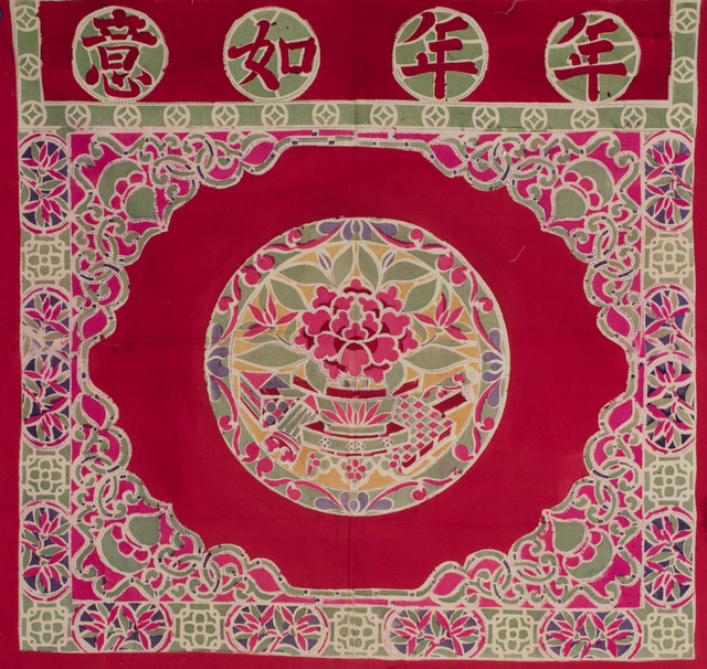 一件年年如意纹彩印桌围,上方以“年年如意”为题,下方中心部位是圆形适合图案,表现牡丹花盆和琴棋书画代表的“四艺”题材,寄寓生活富贵、精神丰盈。桌围四周以中心对称的方式分布葫芦、莲花、藤蔓等纹样,寓意福禄绵延、生生不息。