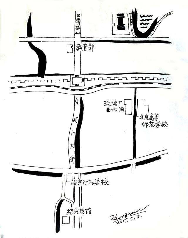 与此同时,在教育部所在的宣武门一带,另外一处新的文化空间也在悄然形成。教育部在宣武门内大街西侧,正好在众议院的北边,然而比起众议院来,教育部只能算是个清水衙门,不少部员居住在宣南地区的会馆,过着清苦的京官生活。供职于教育部社会教育司的鲁迅即是其中之一,他住在宣武门外南半截胡同的绍兴县馆里,部中公务清简,暇时鲁迅便流连于附近的琉璃厂,购买书籍、碑帖及拓片,回到会馆便以抄校古碑遣日,虽寂寞却不以为意。然而,北京大学的变动也使他平静的生活起了涟漪。蔡元培既是他的同乡,又曾是他的老上级,因为要改革北京大学的文科,添设古希腊文学方面的课程,便托鲁迅请他的弟弟周作人到北京大学任教。1917年4月,周作人就北京大学之聘,但仍和鲁迅住在绍兴县馆里,日日往返于两地之间,来往的路线多少年后仍记得极为清楚。这一年的8月,鲁迅还应约给北京大学设计校徽图案,一直沿用至今。不过整个1917年,周氏兄弟和《新青年》还没有发生直接的关系。