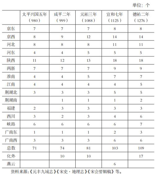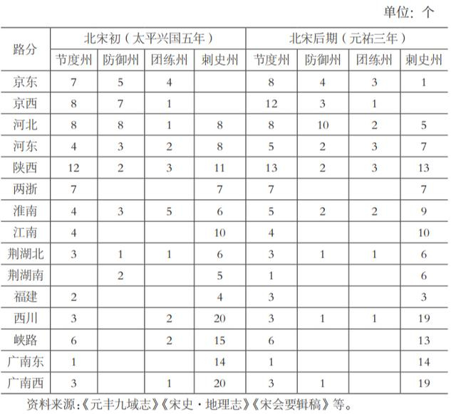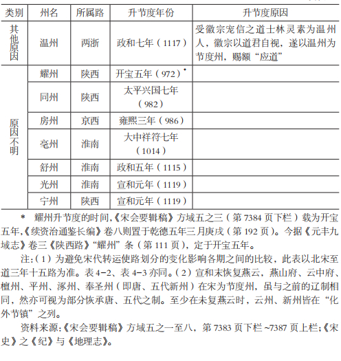 需要注意的是,第二、第三类节镇中的大多数在宋初已经存在,宋代新升的不多。这是因为这两种原则,早在唐末已经形成。各路的政治、军事中心亦是经过长期的发展才最终形成,尤其是南方地区,自唐末以后,各地政治中心几乎没有明显的变化。又,汴洛一带本就是中原的中心地带,在中晚唐方镇产生、发展的过程中,已形成许多节镇,五代各朝定都非洛即汴,首都位置便没有大的变动,因而宋代京畿附近的节镇,有一半形成于宋开国之前。而第一类因军事上的原因而升等的,大多集中在疆域变动较大的陕西路西部,另有南方、西南近边地区的个别州。河北路则不同,其地自唐中叶已形成割据之势,而且此后主要的外敌一直是北方的契丹,故河北一带在唐代便用兵最多,大部分节镇至五代末早已形成,入宋亦未有大变。前代的遗产具有相当的合理性,故顺理成章地为宋所接受,只是按形势变化而新设少数节镇。