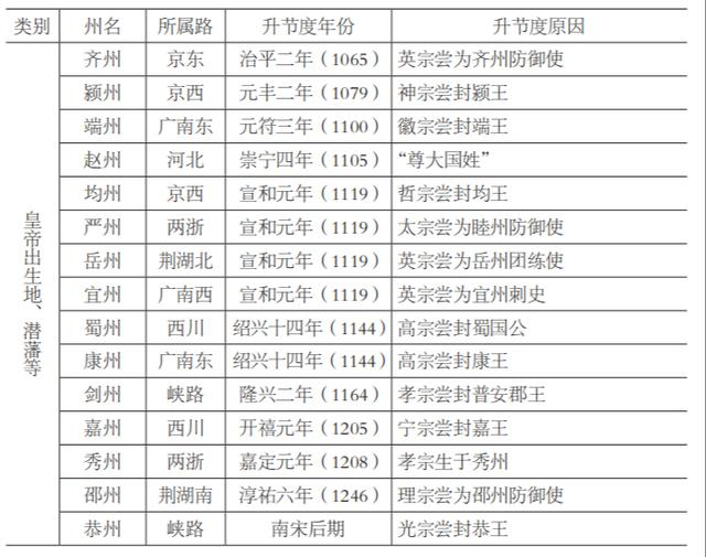 第四,皇帝之“潜藩”“潜邸”,应升府并升为节度,这在宋代已形成制度。“祖宗典故,应系潜藩,皆升节镇。”“故事,潜藩州建军府名。旧制,天子即位,尝所领州镇,自防御州而下皆升军名;若节镇州则建为府。”因此而升节镇,有太大的偶然性,地理因素在里面不起什么作用,但在宋代,因此而升节镇的恰恰最多。几乎每一个皇帝在即位前都曾被封为某王,或在名义上为某州防御使、团练使、刺史,登基之后,这些州就要升节度、升府。某些“潜邸”州,祖宗在位时未来得及升节镇,隔了百来年,最终还是升了。经过两宋三百余年,因“潜藩”而升节镇的就达二十余个,占宋代新升节镇大半。此制度在徽宗时“造就”了一大批节度州,但在南宋并未完全得到实行,“比年以来,升蜀州为崇庆府,剑州为隆庆府,恭州为重庆府,嘉州为嘉定府,秀州为嘉兴府,英州为英德府。蜀、剑既有崇庆、普安军之额,而恭、嘉以下独未然。故幕职官仍云某府军事判官、推官,大与府不相称,皆有司之失也”。“光宗自荣州刺史进封恭王,……而荣州至今不锡军名,盖中书之误。”其“失”“误”之一,是潜藩原非节度州者必当升节度,而南宋不然,如上述荣州至宋末仍为军事州,孝宗尝为和州、贵州防御使,理宗尝为成国公,度宗尝为贵州刺史,却未升和、贵、成、英等州为节度州;其“失”“误”之二,是南宋时不再严格遵循潜藩先升节度后升府的原则,某些州已升府却仍未升节度,如英州(英德府)。某些时候,潜藩升节度州有滞后性,比如哲宗尝为均国公,升均州为节度在徽宗宣和元年,这也是制度未完全施行的表现。嘉州为宁宗潜藩,然升节度在开禧元年(1205),距宁宗即位已有十余年。秀州为孝宗出生之地,不过其于嘉定元年升嘉兴军节度之时,距孝宗即位(1162)已近半个世纪。恭州(重庆府)于南宋后期最终升作节度,然距其于淳熙十六年升府已隔多年。