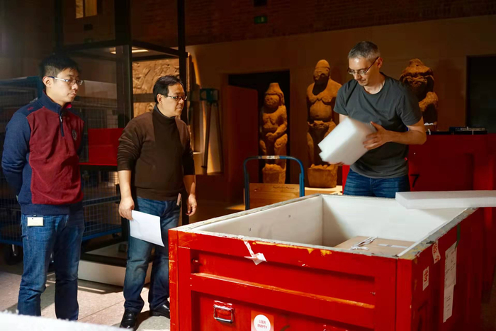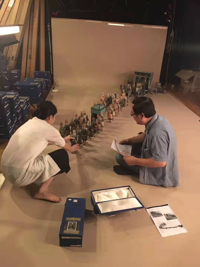 上海博物馆陶瓷研究部副主任彭涛在布置陶瓷文物