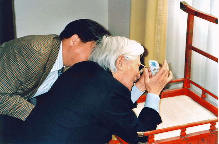 2002年3月,陈克伦(左)与汪庆正先生(右)一起在日内瓦鲍尔文物馆考察成化斗彩。
