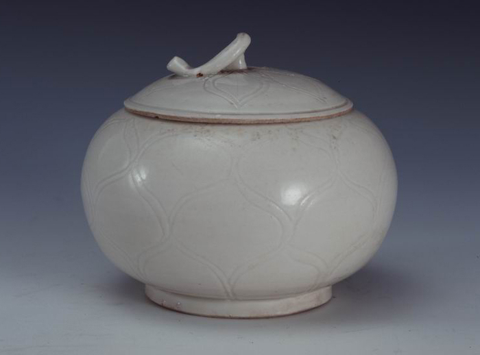 五代 定窑白釉“官”字款划花莲瓣纹盖罐