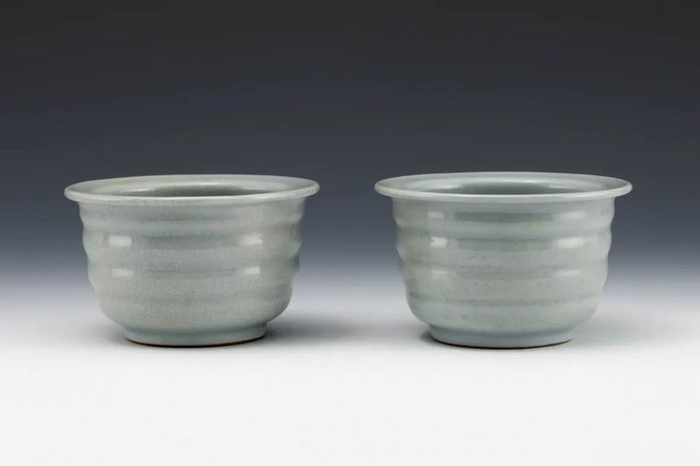 清 雍正 景德镇窑仿汝釉弦纹花盆(一对),胡惠春、王华云 1950年捐赠
