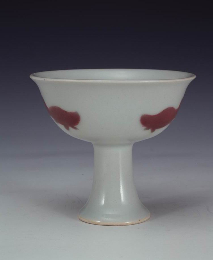 明 宣德 景德镇窑釉里红三鱼纹高足杯
