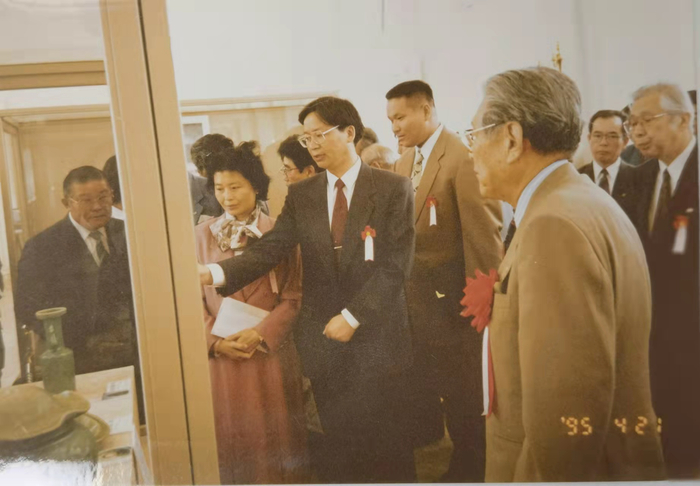 1995年,日本佐贺有田上海博物馆陶瓷展开幕,陆明华为来宾讲解。
