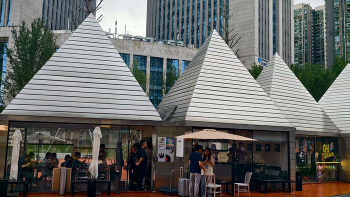 “我是这个村落的村长。”“阿云朵仓”主理人曹国梁对澎湃新闻表示,喀斯特地貌是贵州的特色,而阿云朵仓的设计灵感正来自贵州的洞中村落,用错落坡屋顶、木色调立面重构街巷肌理。他说,在这里,并没有设置标准化动线规划,而是构建村口市集、长桌食集、余庆粮仓、十字街等四个主题集合区,希望可以展现“新贵阳”形象的空间。