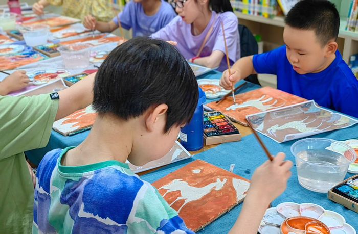 8月3日,梅陇镇兴梅路1123号传来了小朋友欢快的声音。一场“遇见莫高窟——敦煌泥版画体验”活动正热火朝天地举行着,孩子们七嘴八舌,跟着老师体验了一次非遗工匠的作画。