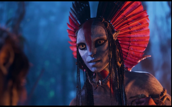 《阿凡达3:火与烬》海报今年7月发布的首支官方正式预告片已经揭晓了《阿凡达3》中将引入两个新的部族——驾驭着如热气球般飞行器的游牧民族风之商队以及涂着黑、白、红三色战纹的灰烬族。而最新的预告片泄露了更多的内容:灰烬族的首领瓦朗因族人死于火山爆发,未得爱娃女神的庇护而心生怨恨,遂与邪恶的迈尔斯·夸里奇上校联手。她还抓住了“蜘蛛”,机缘巧合之下发现身为人类的“蜘蛛”在潘多拉星球上竟然可以不用呼吸器活动。这一点也引发了杰克·萨利和奈提莉担忧人类因此得以大举进攻星球。果然,纳威人转眼就面临一场与人类及瓦朗领导的灰烬族的恶战。