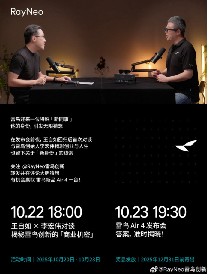 根据官方海报,在10月23日的新品发布会上,王自如将参与RayNeo Air 4 AR眼镜的发布活动。小雷觉得,王自如的数码评测背景和他在格力积累的渠道改革经验,或许正是雷鸟创新看中的。