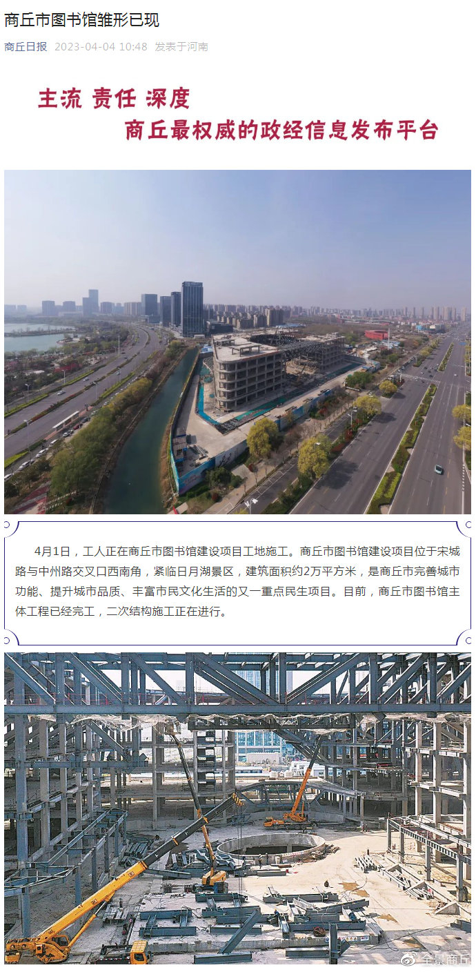 2023年04月,商丘市图书馆主体工程已经完工,二次结构施工正在进行。