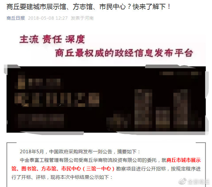 2018年5月,中国政府采购网发布一则公告,摘要如下:中金泰富工程管理有限公司受商丘华商物流投资有限公司的委托,就商丘市城市展示馆、图书馆、方志馆、市民中心(三馆一中心)勘察项目进行公开招标,按规定程序进行了开标、评标。