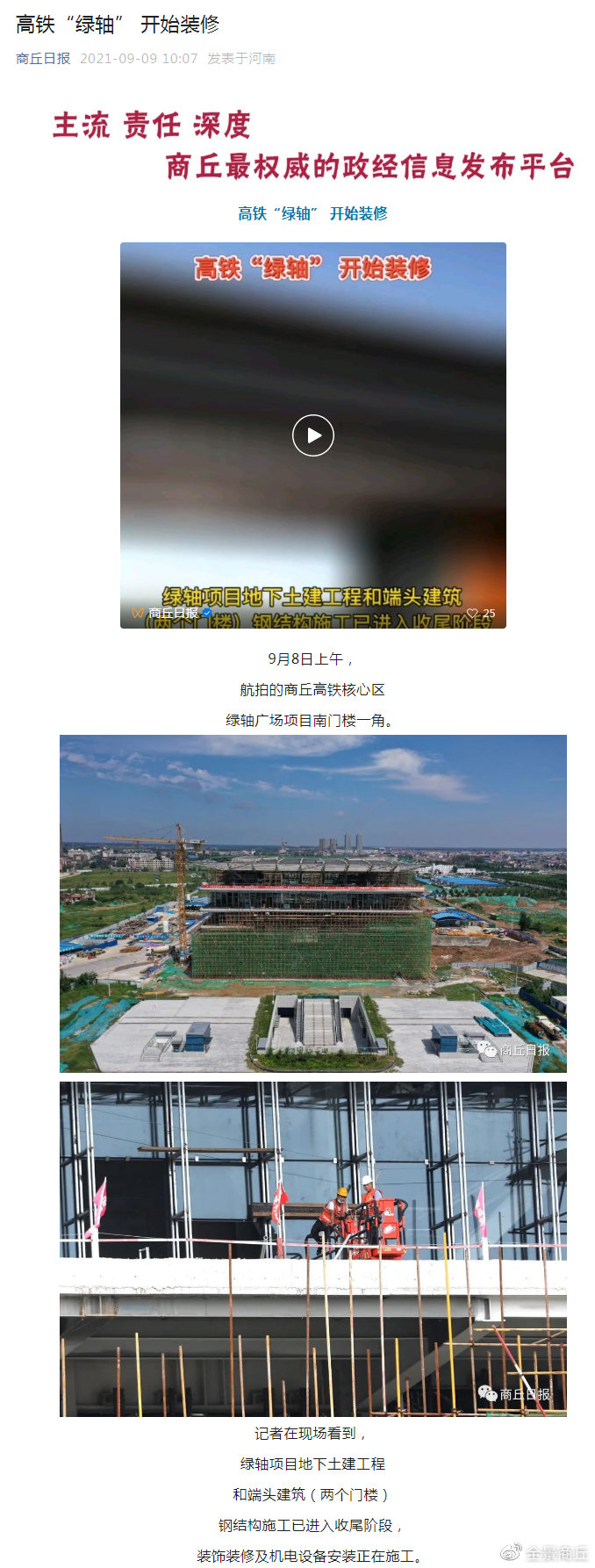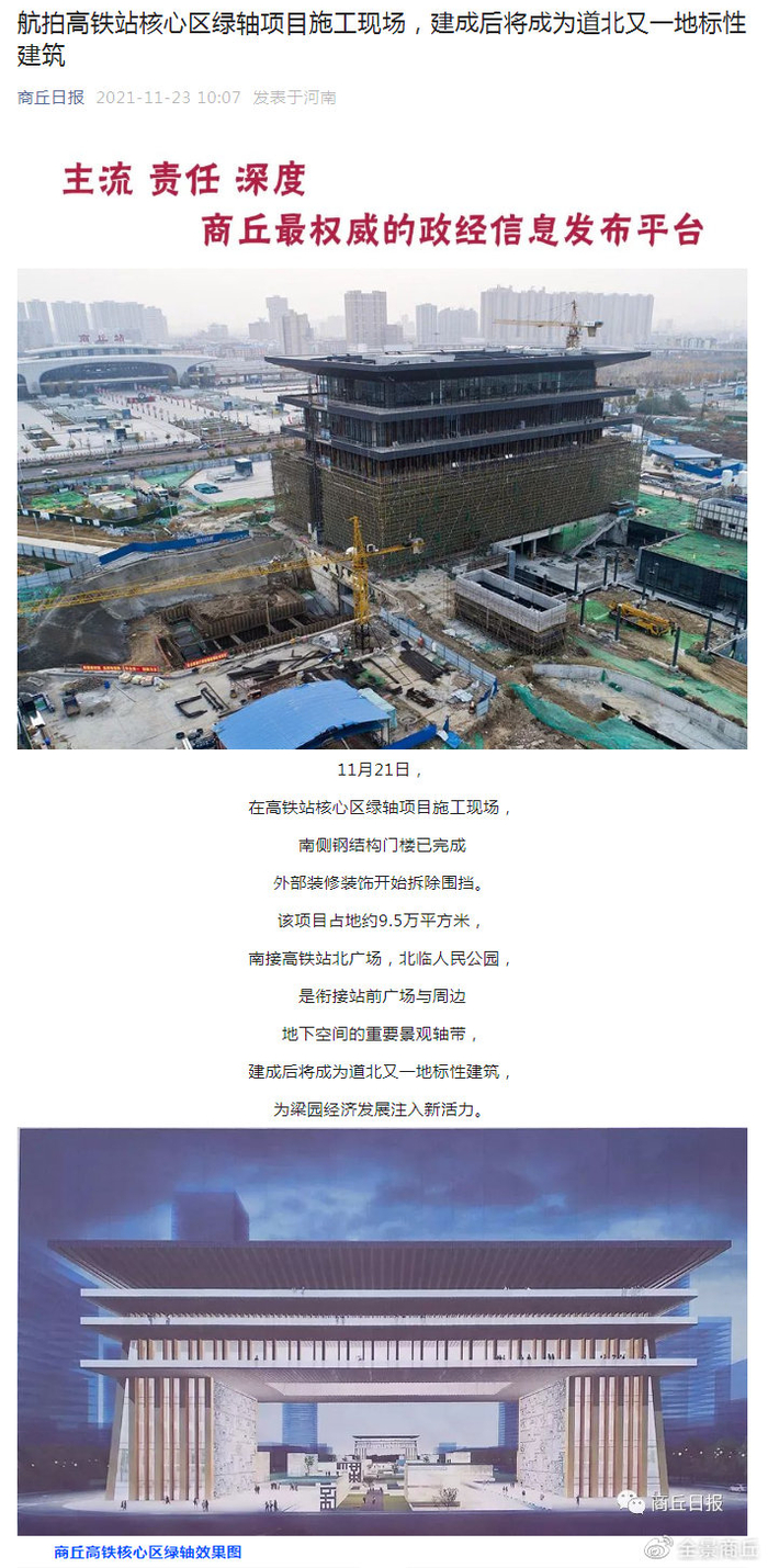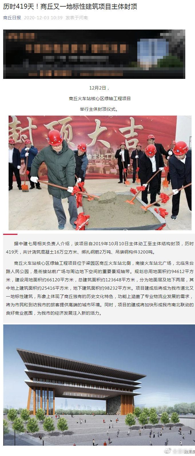 2020年12月,商丘火车站核心区绿轴工程项目主体封顶。